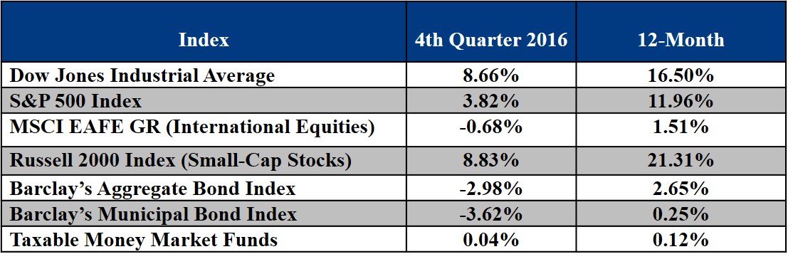 What a year it has been. There were expectations for slow growth, gradually rising interest rates, and a stable but strong U.S. dollar. Those expectations changed on Election Day when Donald Trump won the presidential election. The market rallied on new expectations of a fiscal policy that includes lower taxes for individuals and corporations, infrastructure spending, fewer business regulations and a host of other pro-growth anticipations. Our Investment Committee has been discussing what will change under a Trump Administration. We have been patiently watching his cabinet appointments to gauge what might be in store for future fiscal reform.