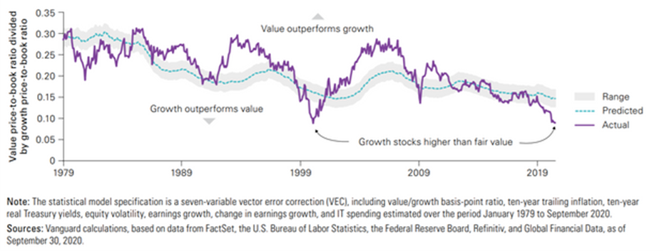 The chart below shows that value stocks tend to outperform growth stocks over longer periods of time. For the brief moments in history when growth stocks have outperformed, the reversal back to value stocks has been swift.